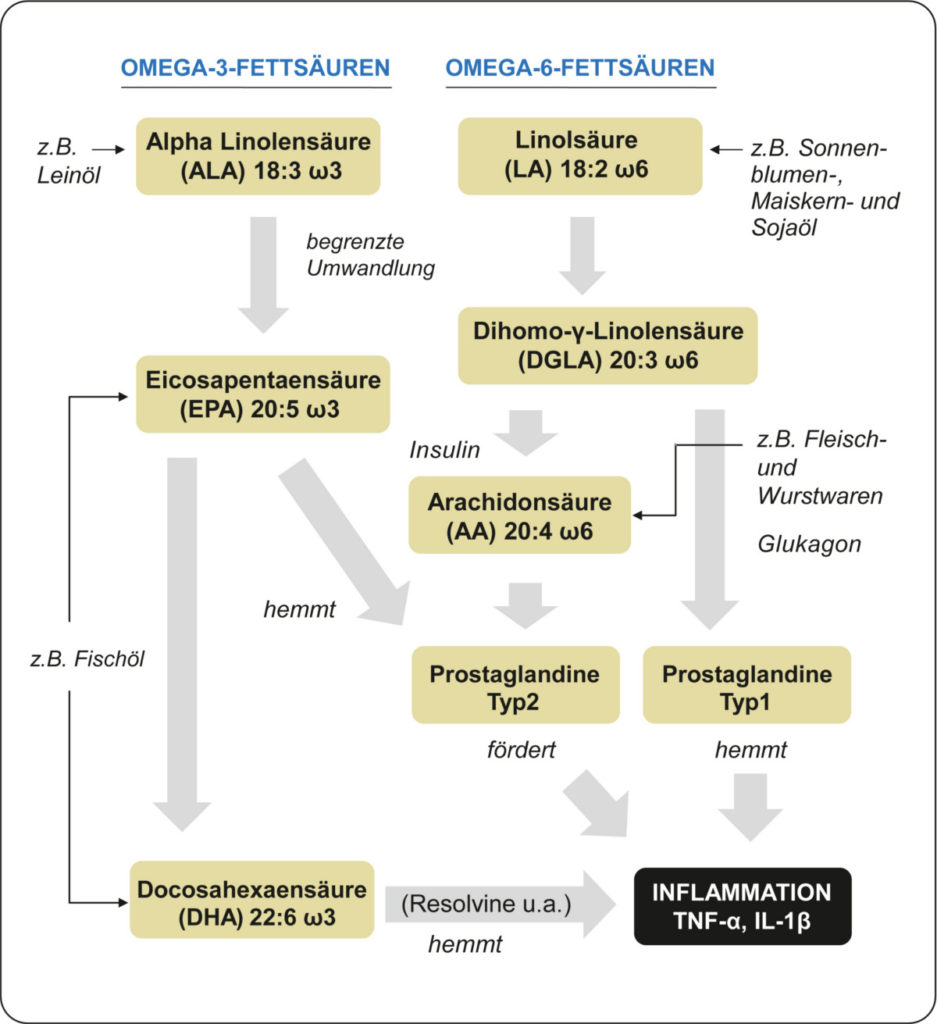 - A high proportion of omega-3 EPA in the body slows down the conversion capacity for the omega-6 fatty acids (omega-3 and omega-6 share the conversion capacity in the body). This indirect effect thus inhibits the formation of the omega-6 arachidonic acid in the body.